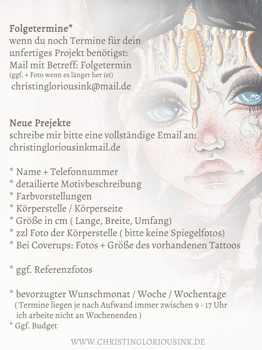 Vielen Dank für das Interesse an meiner Kunst, hier habe ich dir viele wichtige Informationen zu einem Termin bei mir zusammengestellt, sollte es vorab dennoch andere Fragen geben, melde dich gern via Email bei mir.